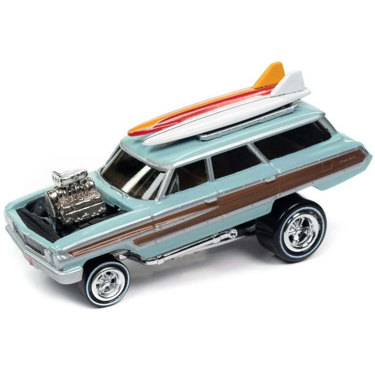 1964 Ford Country Squire Surfin Baby Blue W Woodgrain Panels And Surfboard On Roof 1 64 Diecast Model Car By Johnny Lightning Walmart Com